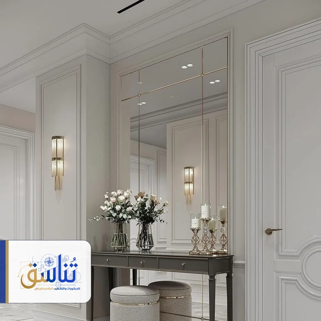 لعشاق طراز النيوكلاسيك، نقوم بتركيب براويز الفوم (Foam Frames) مع شرائط الاستيل الذهبي، بالإضافة إلى تفصيل وتركيب المرايا الديكورية (معينات، شطف) التي تمنح المجالس أو المداخل فخامة عصرية