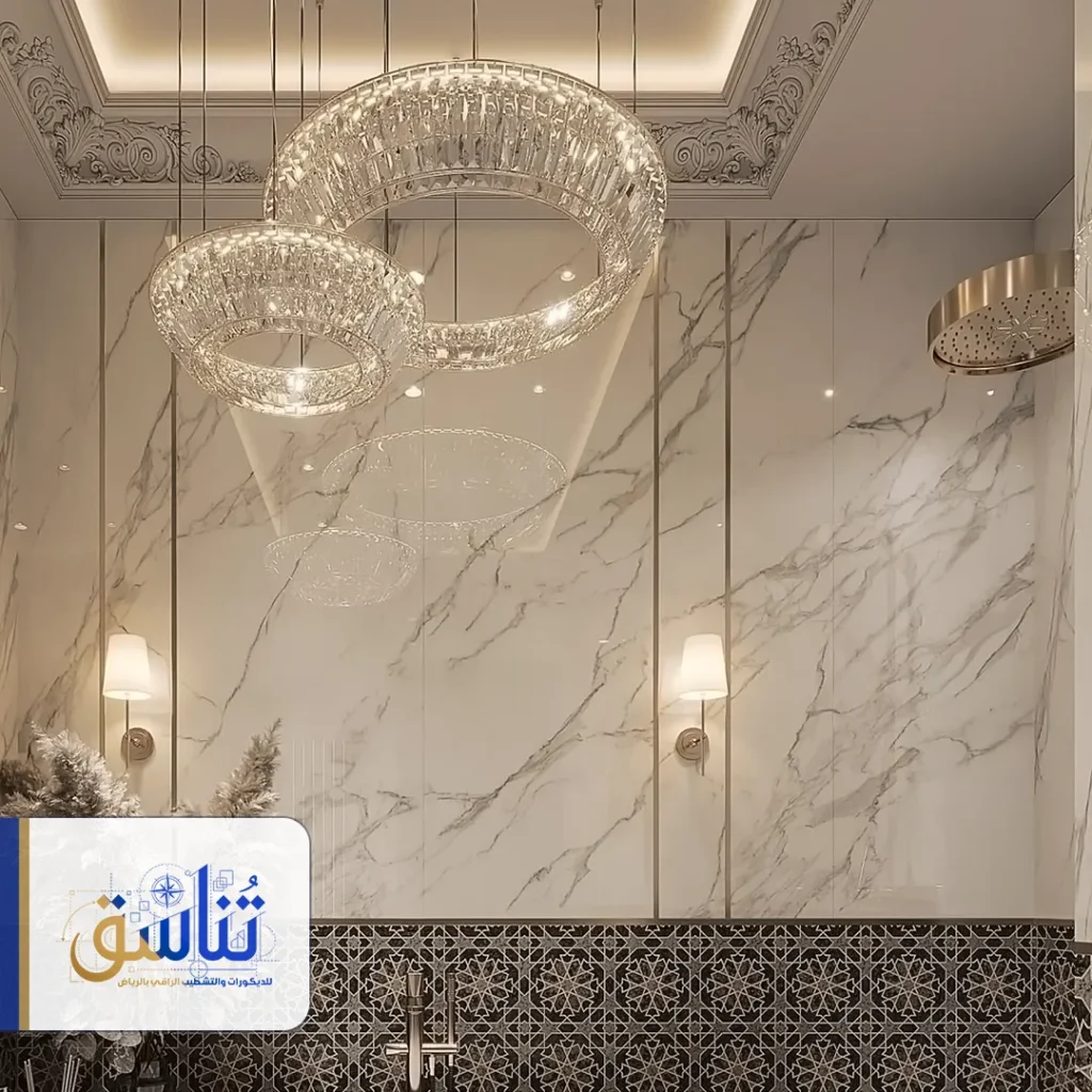 وداعاً للتكاليف الباهظة. نقوم بتركيب بديل الرخام (PVC) ذو اللمعة الزجاجية، وتنسيقه مع شرائح بديل الخشب (WPC) لعمل خلفيات تلفزيون، مداخل، أو ديكور صالات استقبال فخمة.