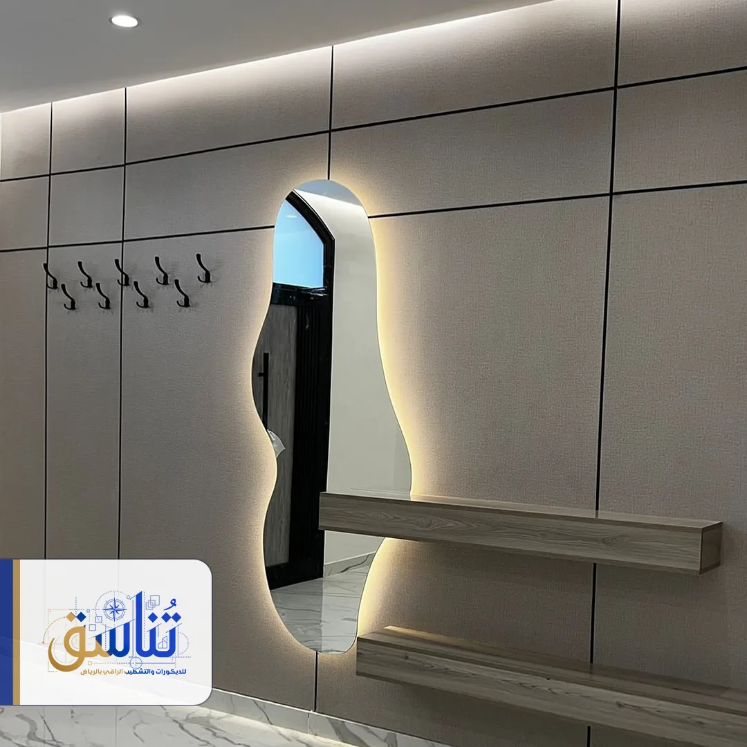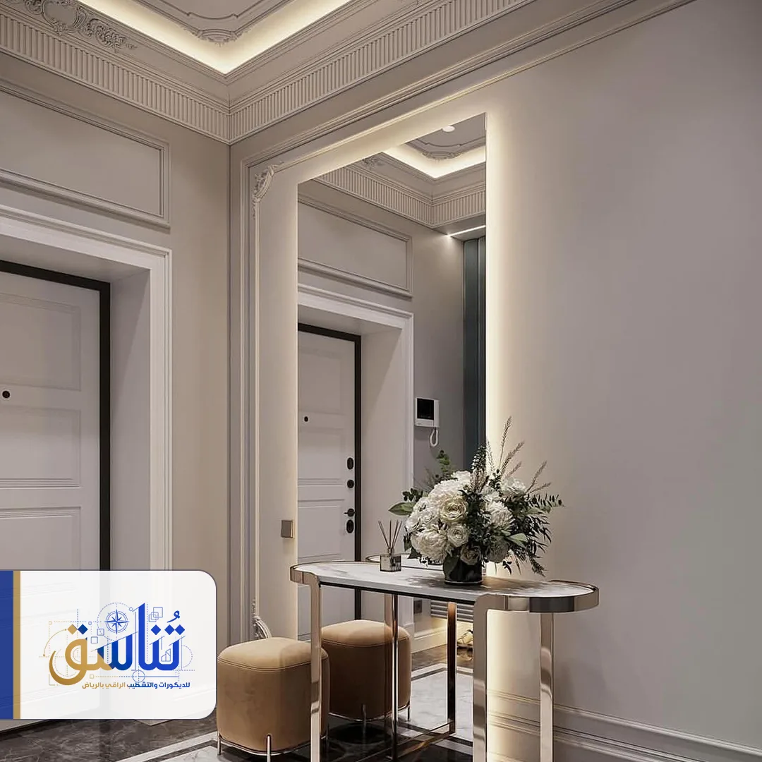 لعشاق طراز النيوكلاسيك، نقوم بتركيب براويز الفوم (Foam Frames) مع شرائط الاستيل الذهبي، بالإضافة إلى تفصيل وتركيب المرايا الديكورية (معينات، شطف) التي تمنح المجالس أو المداخل فخامة عصرية
