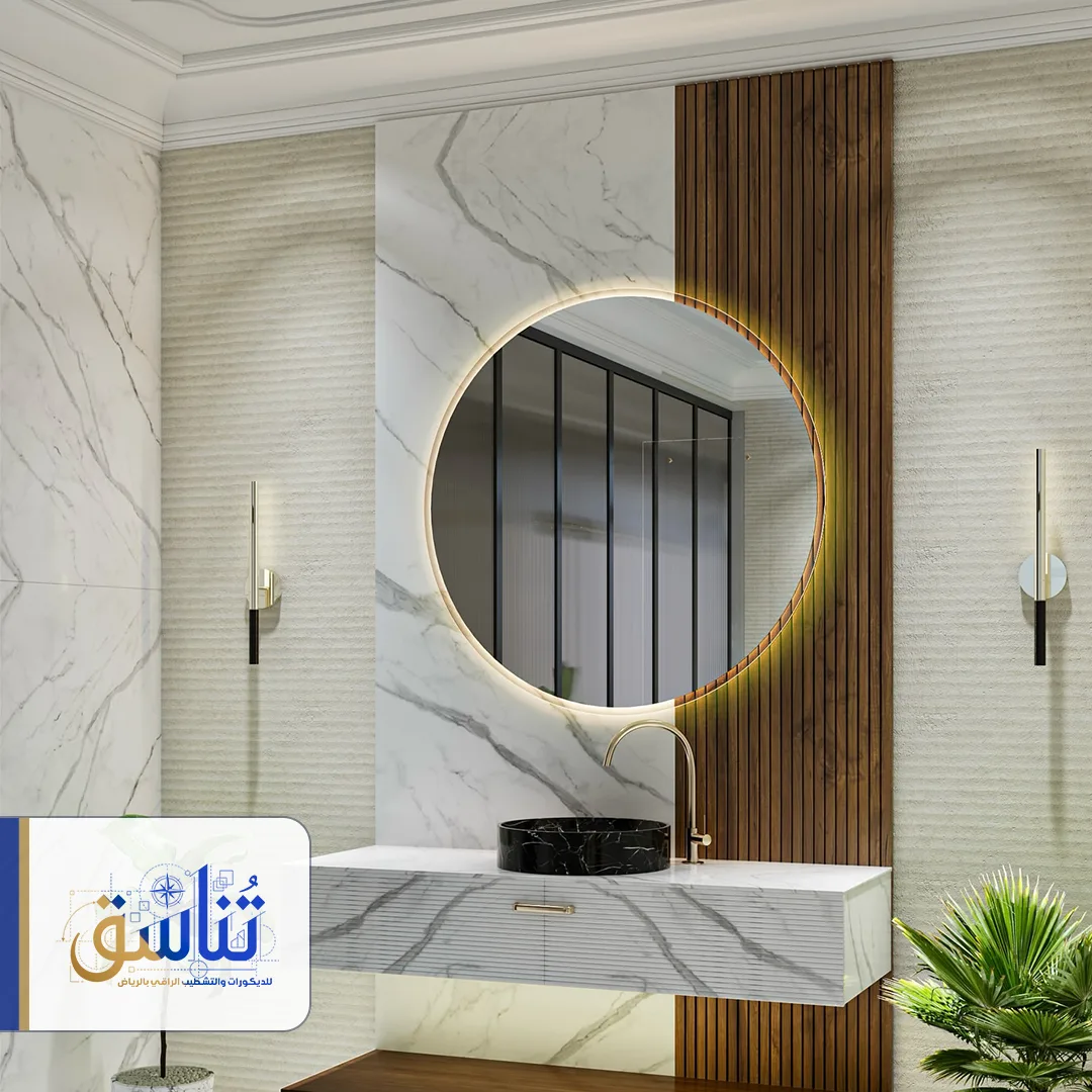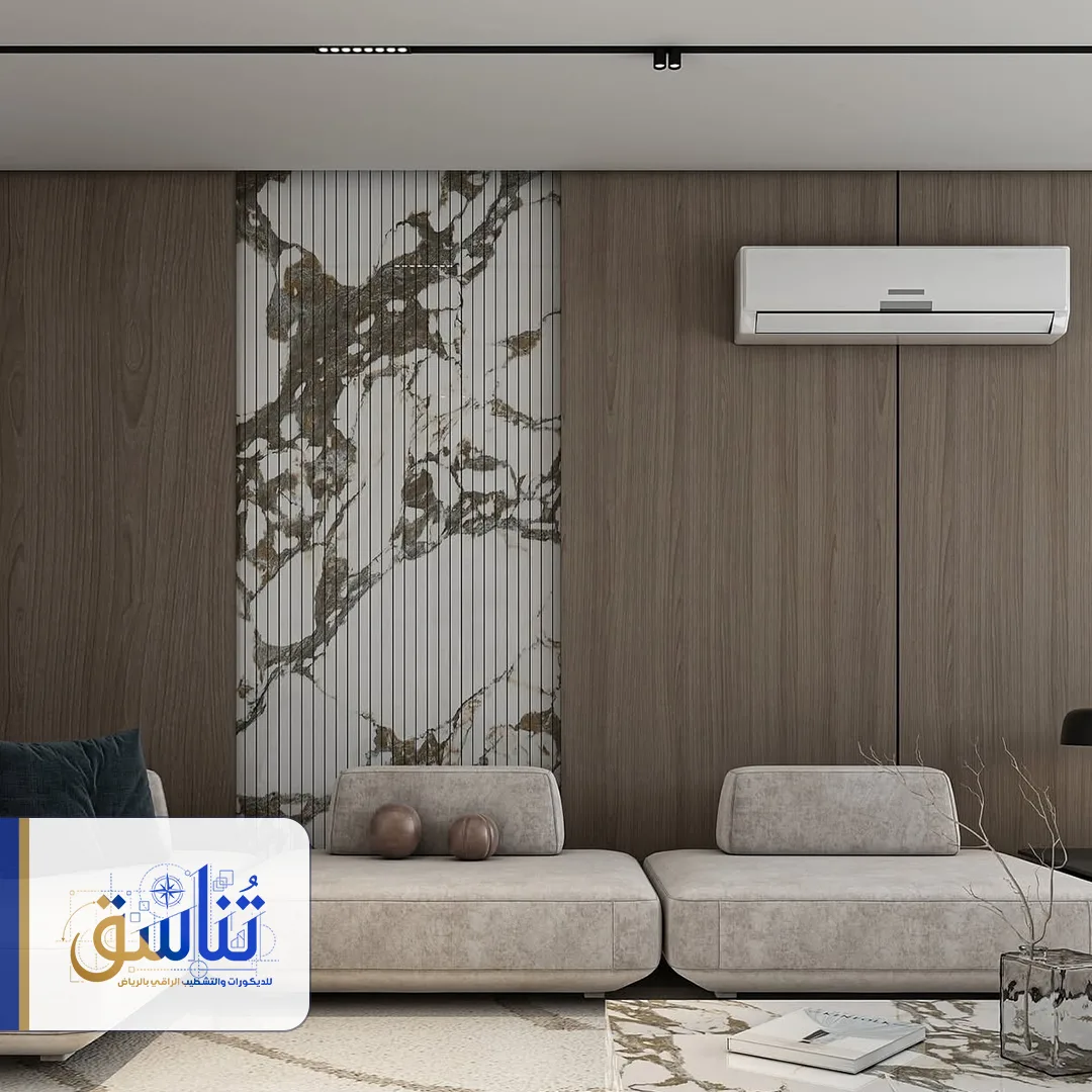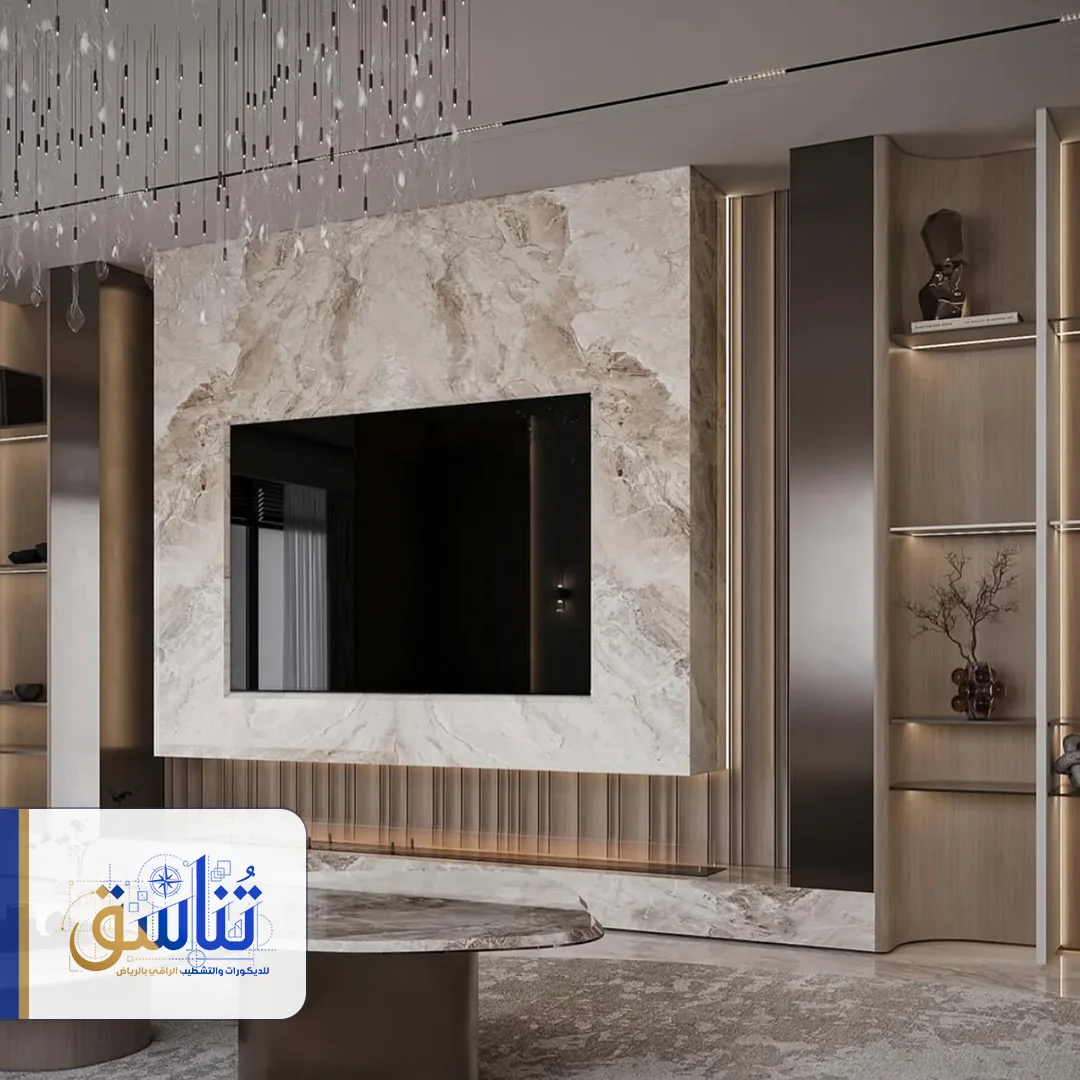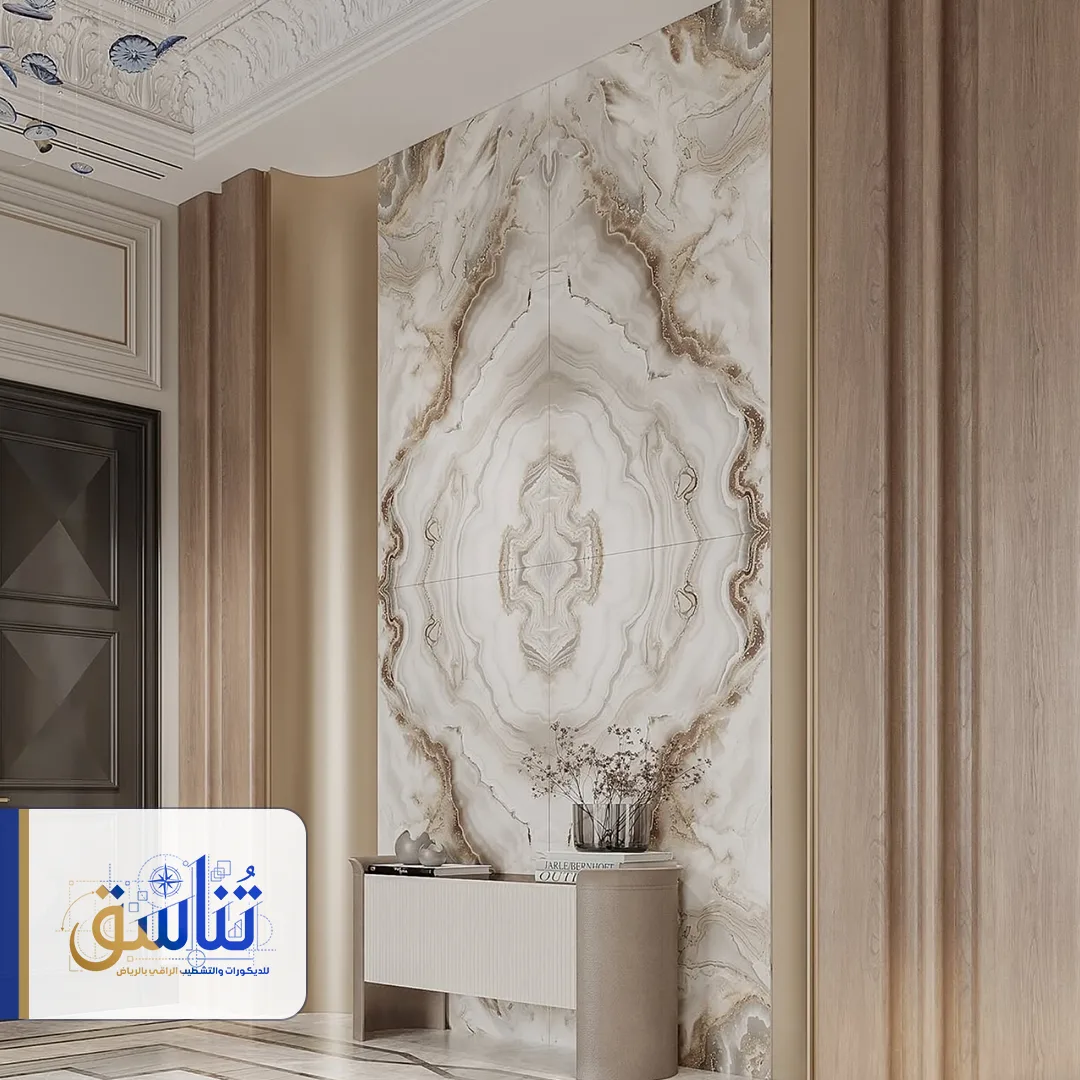 وداعاً للتكاليف الباهظة. نقوم بتركيب بديل الرخام (PVC) ذو اللمعة الزجاجية، وتنسيقه مع شرائح بديل الخشب (WPC) لعمل خلفيات تلفزيون، مداخل، أو ديكور صالات استقبال فخمة.